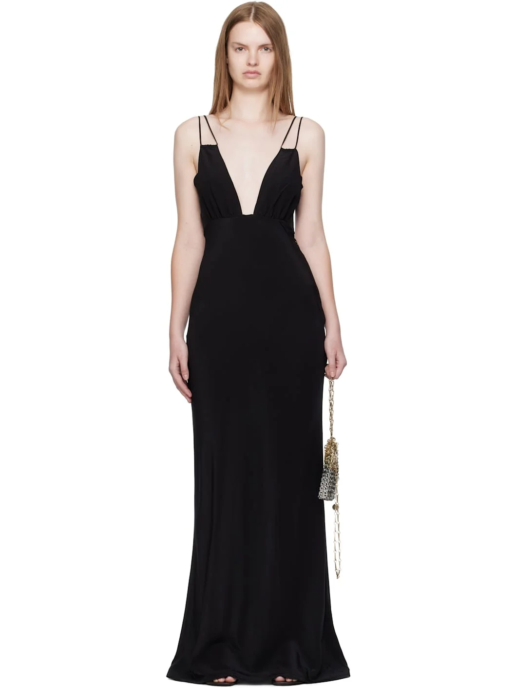 Silk georgette slip dress. · Plunging V-neck · Gathering at chest · Fixed spaghetti straps · Concealed zip closure at side seam · Self-tie straps at open back Part of the Elemental 06 collection. Supplier color: Black 100% silk. Made in New Zealand 252438F055002