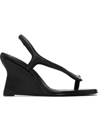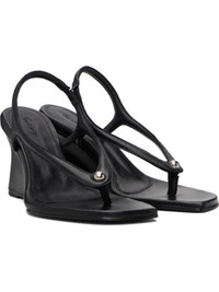 Buffed leather heeled sandals. · Square toe · Thong-style strap with stud at vamp · Partially elasticized slingback strap · Logo embossed at padded footbed · Covered wedge heel with rubber injection · Leather sole · Heel: H3.5" Supplier color: Black Upper: leather. Sole: leather, rubber. Made in Italy 252438F125003