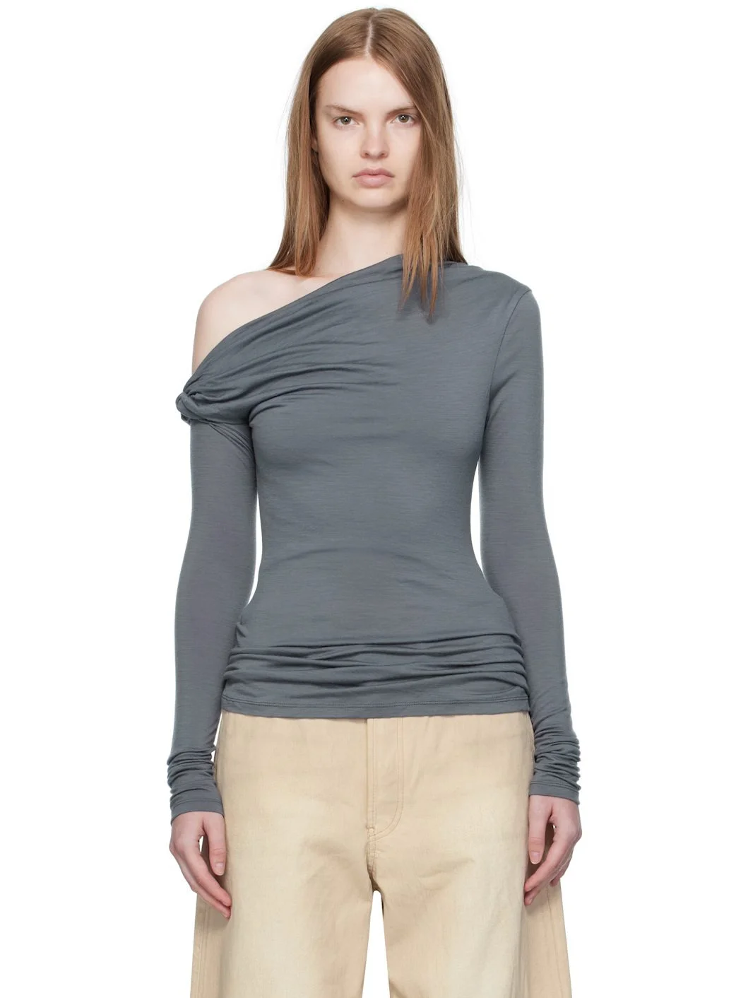 Merino wool jersey top. · ZQ-certified merino wool · Draping throughout · Single-shoulder construction · Twisted detailing at shoulder Part of the Elemental 06 collection. Supplier color: Steel 100% merino wool. Made in New Zealand 252438F110013