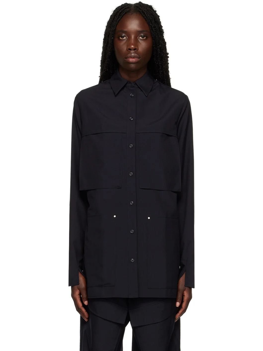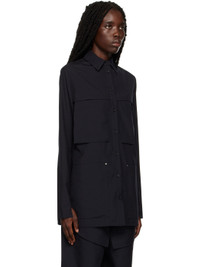 Paneled polyester and wool-blend gabardine shirt. · Spread collar · Button closure · Patch pockets · Vented cuffs and side seams · Silver-tone hardware Supplier color: Ink 55% polyester, 45% wool. Made in New Zealand 231438F109001