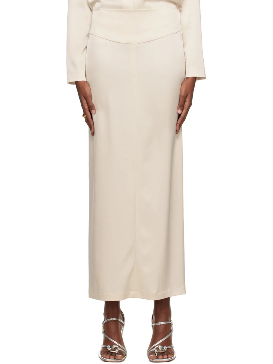 Triacetate- and polyester-blend satin skirt. · Self-tie straps at waistband · Darts at back · Central slit at back hem · Unlined Part of the SSENSE exclusive Work Capsule. Supplier color: Pearl 80% triacetate, 20% polyester. Made in New Zealand 231438F093004