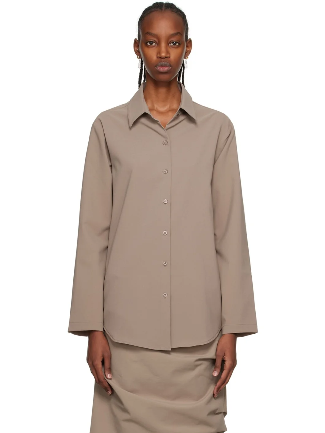 Stretch polyester georgette shirt. · Spread collar · Button closure ·Shirttail hem · Vented cuffs Part of the SSENSE exclusive Work Capsule. Supplier color: Rock 85% polyester, 15% spandex. Made in New Zealand 231438F109006