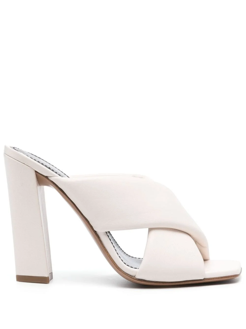 110mm leather sandals Highlights - Milk white - Calf leather - Grained texture - Square open toe - Crossover strap at the toe - Branded footbed - Leather lining - High block heel - Leather outsole - Slip-on style Made in Italy Composition Lining: Calf Leather 100% Sole: Calf Leather 100% Outer: Calf Leather 100% SIZE & FIT Measurement HEEL 4.33 in(11 cm)