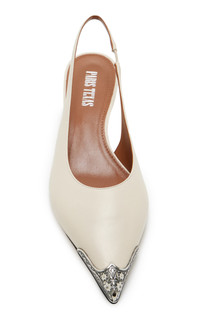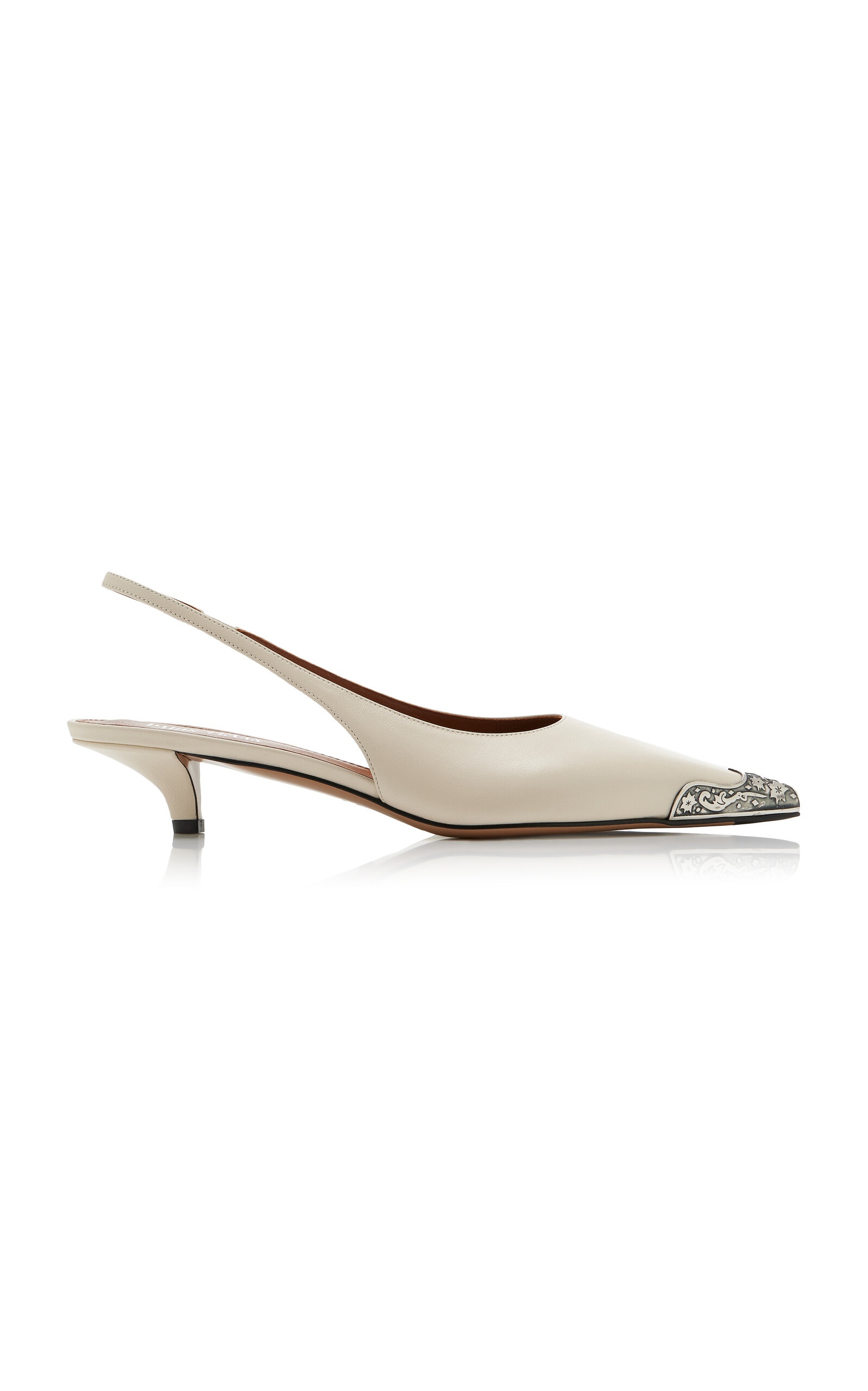 High-end Italian footwear brand Paris Texas was established in 2015 by Annamaria Brivio. As the name suggests, Paris Texas plays with contrast, capturing the brand’s dual soul. Parisian chic sensuality meets the fearless audacity of Texan cowboys. Made from smooth calfskin, the 'Jessica' slingbacks have a pointed-toe silhouette with a Western-inspired toe cap. The low heel makes them endlessly comfortable. PRODUCT DETAILS - Heel height measures approximately 35mm/ 1.35" - Slip on - Composition: calfskin leather - Designer color: Milk - Made in Italy