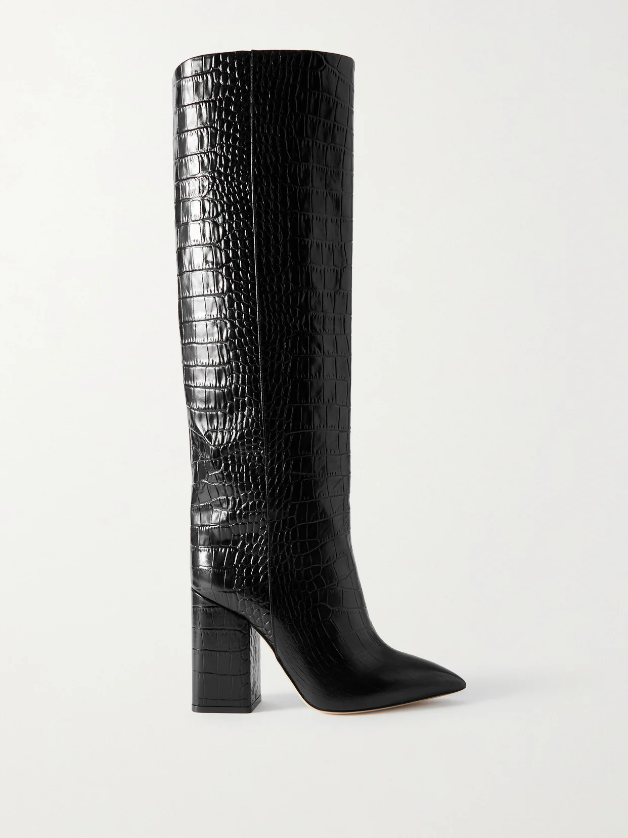 Dial up your look with Paris Texas' 'Anja' knee boots. They're crafted from croc-effect leather with pointed toes and rest on chunky block heels. Show them off with mini hemlines.