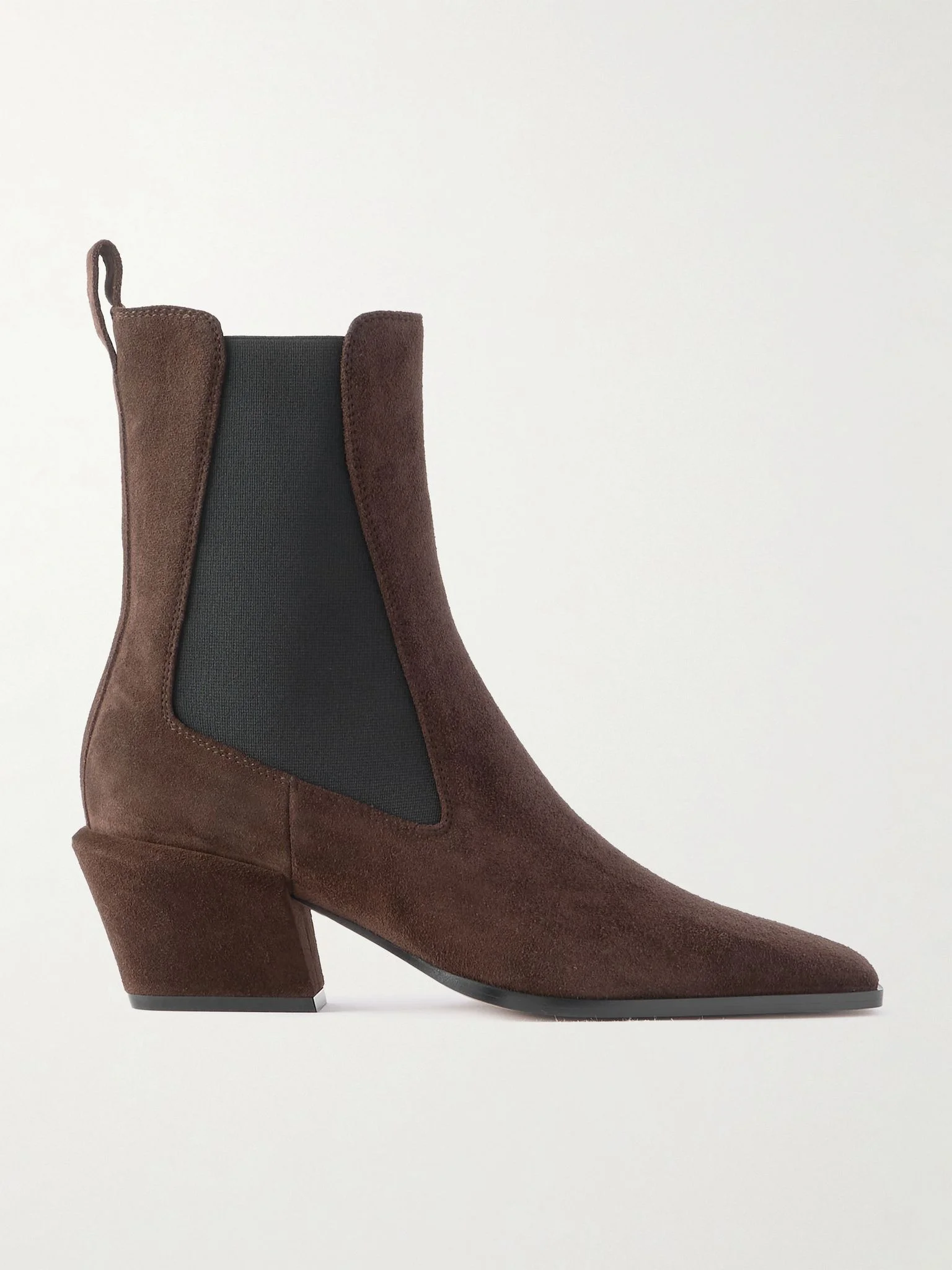 Paris Texas' footwear combines French elegance with southern flair. Crafted in Italy from suede, these 'Bettina' ankle boots have elongated square toes and slanted block heels that offer 50mm of lift. The elasticated side panels and pull tabs allow for easy on and off. Size & Fit - Fits true to size, take your normal size - Italian sizing Details & Care - Heel measures approximately 50mm/ 2 inches - Chocolate suede (Calf) - Pull on