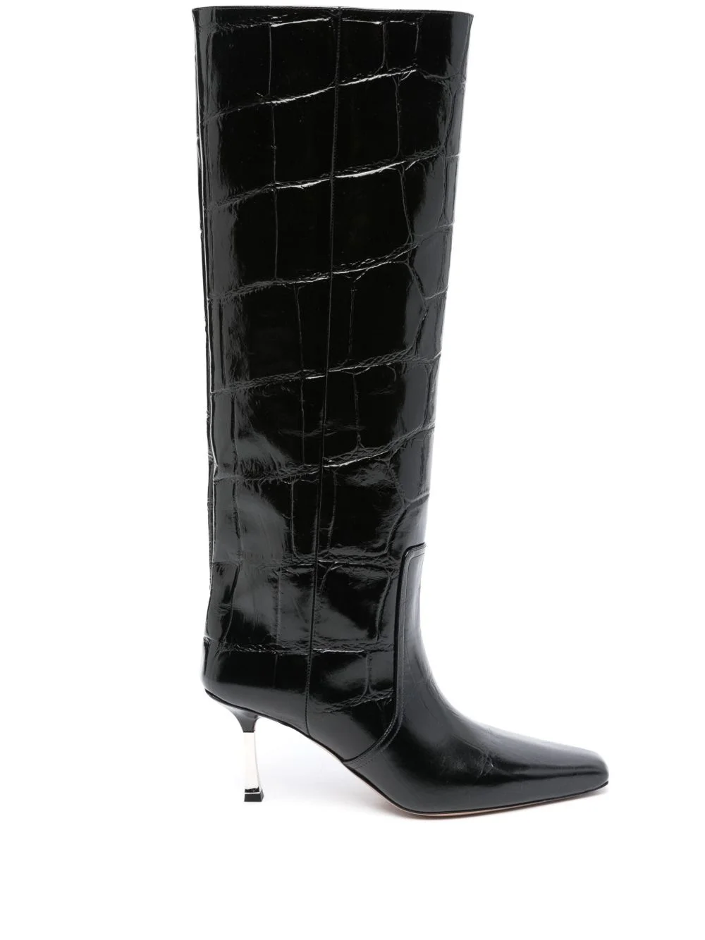 80mm leather boots Highlights - Black - Calf leather - Embossed crocodile effect - Square toe - High heel - Leather sole - Leather lining Made in Italy Composition Outer: Calf Leather 100% Lining: Calf Leather 100% Sole: Calf Leather 100% SIZE & FIT Measurement CIRCUMFERENCE 14.17 in(36 cm) HEEL 3.14 in(8 cm) HEIGHT 16.53 in(42 cm)