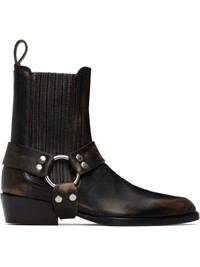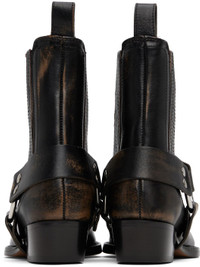 Ankle-high buffed leather boots in black. · Smudging throughout · Pointed square toe · Elasticized gusset at sides · Harness-style straps at sides · Pull-loop at heel collar · Buffed leather lining · Stacked leather block heel with rubber injection · Leather sole · Heel: H1.5" Supplier color: Black Upper: leather. Sole: leather, rubber. Made in Italy 252616F113007