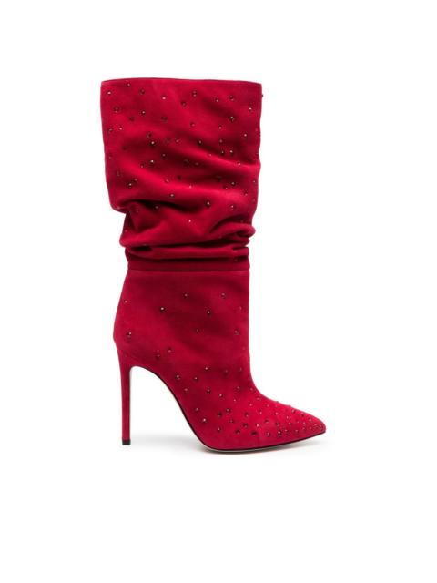 Holly 110mm stiletto boots black calf leather crystal embellishment ruched detailing mid-calf length pointed toe high heel Made in Italy Composition Lining: Calf Leather 100% Outer: Calf Leather 100% Sole: Calf Leather 100% SIZE & FIT Measurement CIRCUMFERENCE 14.96 in(38 cm) HEEL 4.33 in(11 cm) HEIGHT 10.23 in(26 cm)