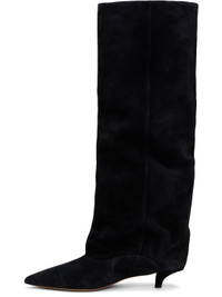 Knee-high calfskin suede boots in black. · Pointed toe · Grained leather lining · Covered kitten heel with rubber injection · Leather sole · Heel: H1.5" Supplier color: Off black Upper: calfskin. Sole: leather, rubber. Made in Italy 242616F115021