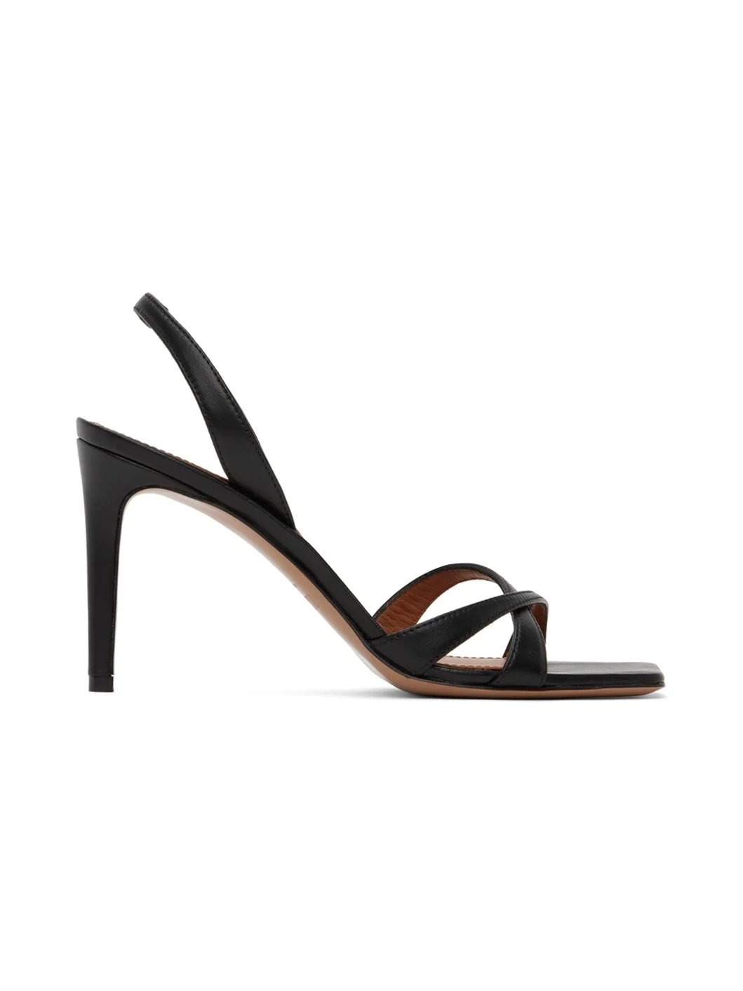 Grained leather heeled sandals in black. · Open square toe · Criss-crossing straps at vamp · Elasticized slingback strap · Covered stiletto heel with rubber injection · Leather sole · Heel: H3.5" Supplier color: Black Upper: leather. Sole: leather, rubber. Made in Italy 241616F125028