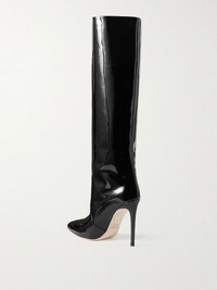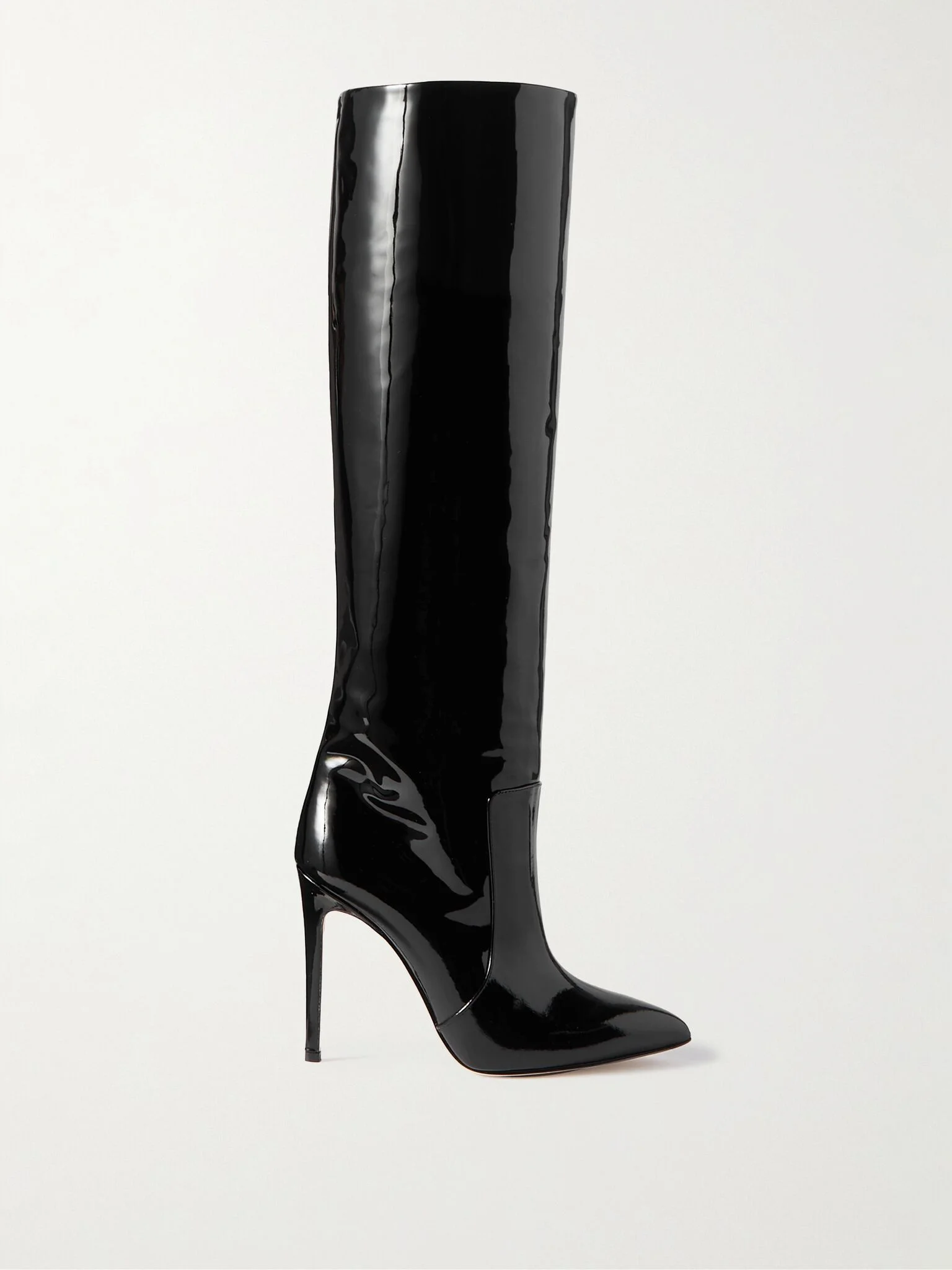 Paris Texas calls its 'Stiletto' knee boots its "most iconic style," re-imagined each season in fresh colors and textures. This version is made from glossy patent-leather with pointed toes and pin-thin heels. Show yours off with short hemlines. Size & Fit - Fits true to size, take your normal size - Italian sizing Details & Care - Heel measures approximately 105mm/ 4 inches - Black patent-leather (Calf) - Pull on