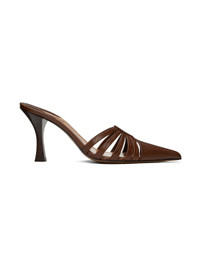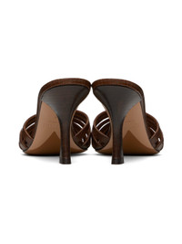 Snake-embossed leather slip-on mules in brown. · Pointed toe · Cutouts at vamp · Logo stamp at grained leather footbed · Stacked leather stiletto heel · Leather sole with rubber injection · Heel: H3.5" Part of the Paris Texas Nadia Lee Cohen capsule collection. Supplier color: Brown Upper: leather. Sole: leather, rubber. Made in Italy 241616F114004