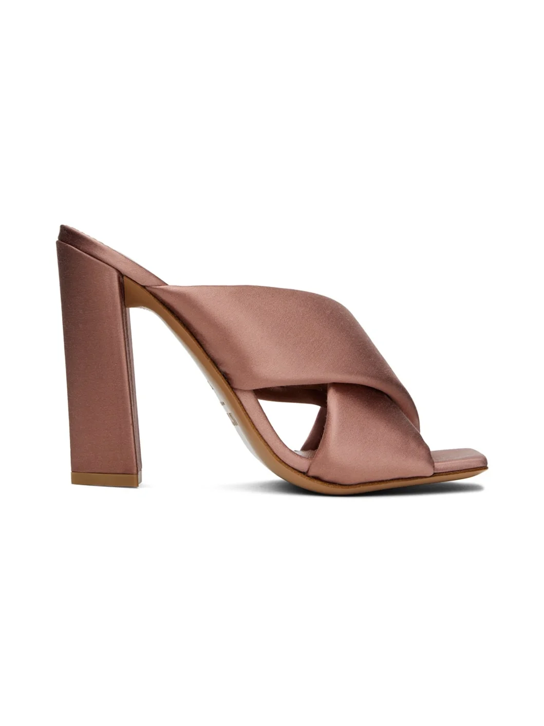 Satin heeled sandals in pink. · Open square toe · Padded criss-crossing straps at vamp · Logo embossed at padded leather footbed · Grained leather lining · Covered block heel with rubber injection · Leather sole · Heel: H4" Supplier color: Dark phard Upper: textile. Sole: leather. Made in Italy 241616F125021