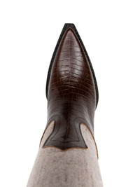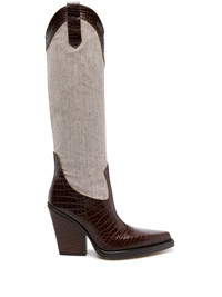 El Dorado 100mm boots Highlights - Chocolate brown/beige - Calf leather - Panelled design - Canvas panelling - Embossed crocodile effect - Pointed toe - Double pull-tab at the opening - Branded leather insole - 100mm cuban heel - Leather outsole - Knee-high - Slip-on style Made in Italy Composition Lining: Calf Leather 100% Outer: Fabric 100%, Calf Leather 100% Sole: Calf Leather 100% SIZE & FIT Measurement CIRCUMFERENCE 14.56 in(37 cm) HEEL 3.54 in(9 cm) HEIGHT 16.14 in(41 cm) Sole height 0.59 in(1.5 cm)