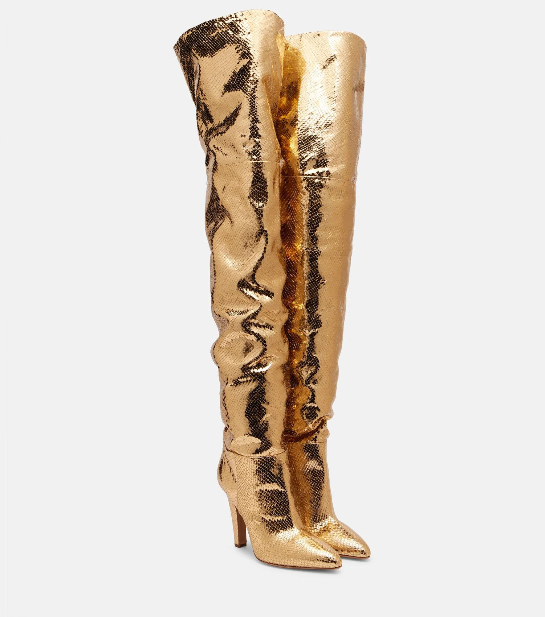 Paris Texas is an Italian shoe label that embodies the idea of contrasts. Made from metallic snake-effect leather, the Elsa boots are an over-the-knee pair with 100mm heels. Product Details - Upper: calf leather - Lining: leather - Sole: leather insole and sole - Toe shape: pointed toe - Made in Italy - Includes: shoe box, dust bag - Designer color name: Gold - Item color: gold - Item number: P01099333 Size & Fit - True to size - For narrow feet, we recommend trying a half size smaller - European sizes - 10cm-4" heel (size EU 38) - 72cm-28.5" shaft height (size EU 38) - 48cm-19" shaft width (size EU 38) - shaft width measured on largest part of boot