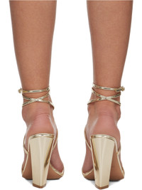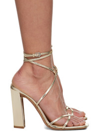 Patent leather heeled sandals in metallic gold tone. · Open square toe · Wraparound pin-buckle ankle strap · Logo embossed at padded leather footbed · Covered block heel with rubber injection · Leather sole · Heel: H4.5" Supplier color: Gold Leather. Made in Italy 241616F125014