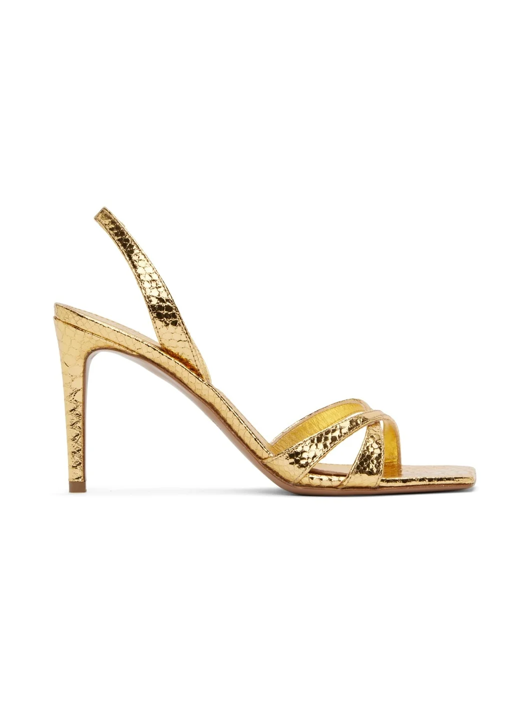 Croc-embossed calfskin heeled sandals in gold tone. · Open square toe · Criss-crossing straps at vamp · Elasticized slingback strap · Covered stiletto heel with rubber injection · Calfskin sole · Heel: H3.5" Supplier color: Gold Upper: calfskin. Sole: calfskin, rubber. Made in Italy 241616F125029