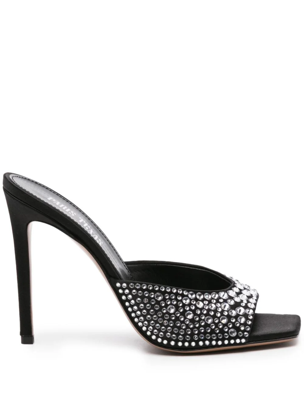 Holly 110mm stiletto mules Highlights - Black - Satin finish - Glass crystal embellishment - Square open toe - Branded leather footbed - 110mm high stiletto heel - Leather outsole - Slip-on style Made in Italy Composition Outer: Satin 100%, Crystal 100% Lining: Calf Leather 100%, Satin 100% Sole: Calf Leather 100% SIZE & FIT Measurement HEEL 4.44 in(11.3 cm)