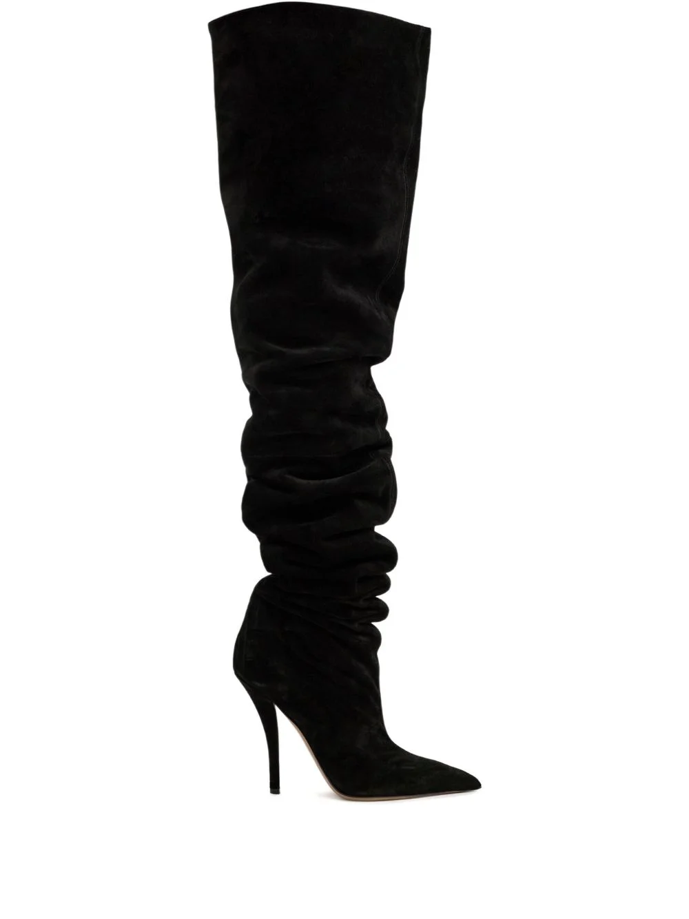 Jessica ruched stiletto boots Highlights - Black - Suede - Stiletto heel - Pointed toe - Ruched detail - Over-the-knee style Made in Italy Composition Outer: Calf Suede 100% Lining: Calf Leather 100% Sole: Calf Leather 100% SIZE & FIT Measurement HEEL 4.13 in(10.5 cm)