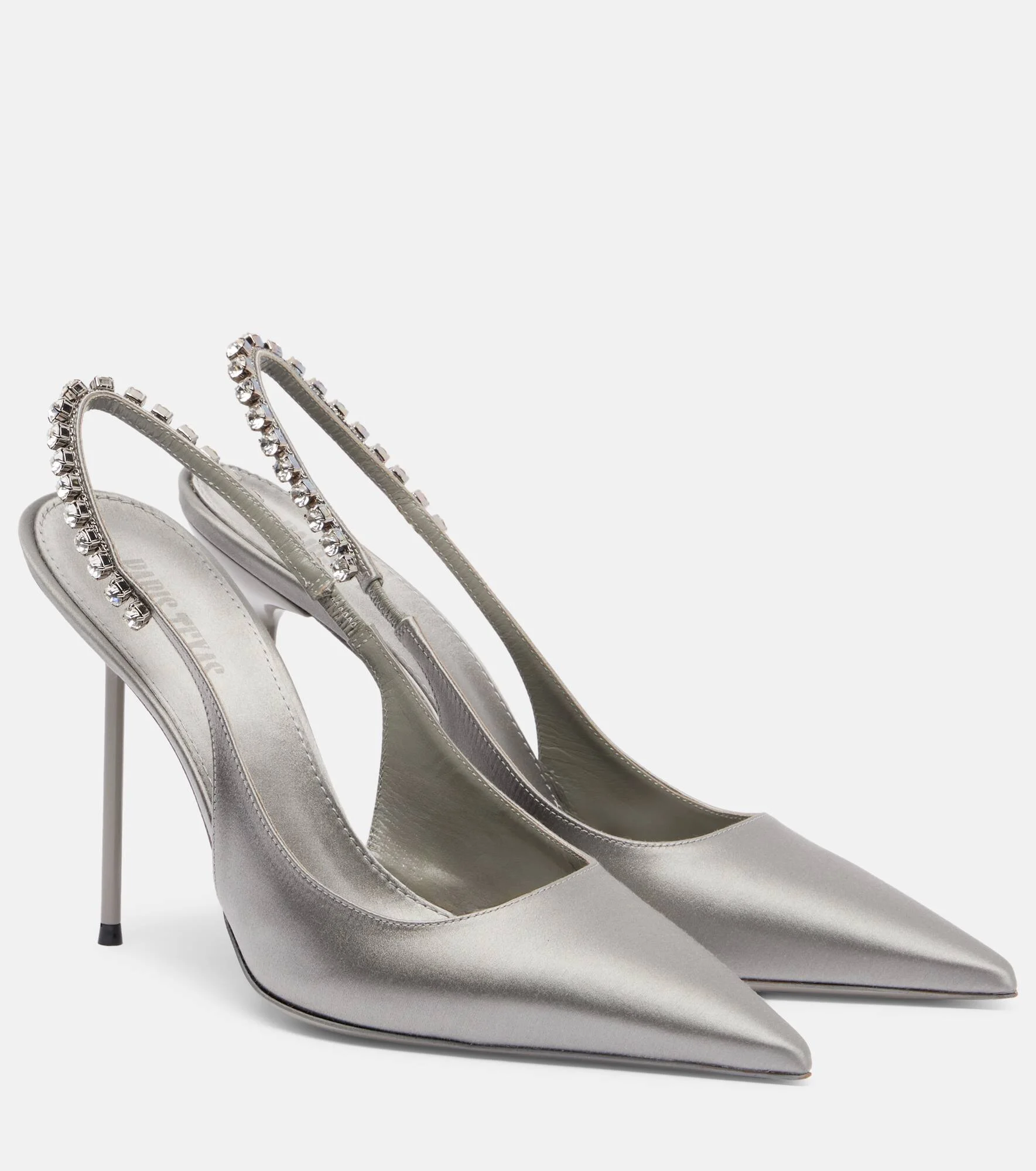 Italian label Paris Texas brings to life striking shoe silhouettes for modern sensibilities. These Lidia slingback pumps have glossy satin uppers, crystal-embellished straps, and 105mm stiletto heels. Product Details - Upper: satin - Lining: satin - Sole: leather insole and sole - Toe shape: pointed toe - Made in Italy - Includes: shoe box, dust bag - Designer color name: Grey - Crystal Diamond - Item color: gray - Slingback strap - Item number: P01099381 Size & Fit - True to size - European sizes - 10,5cm-4" heel (size EU 38)