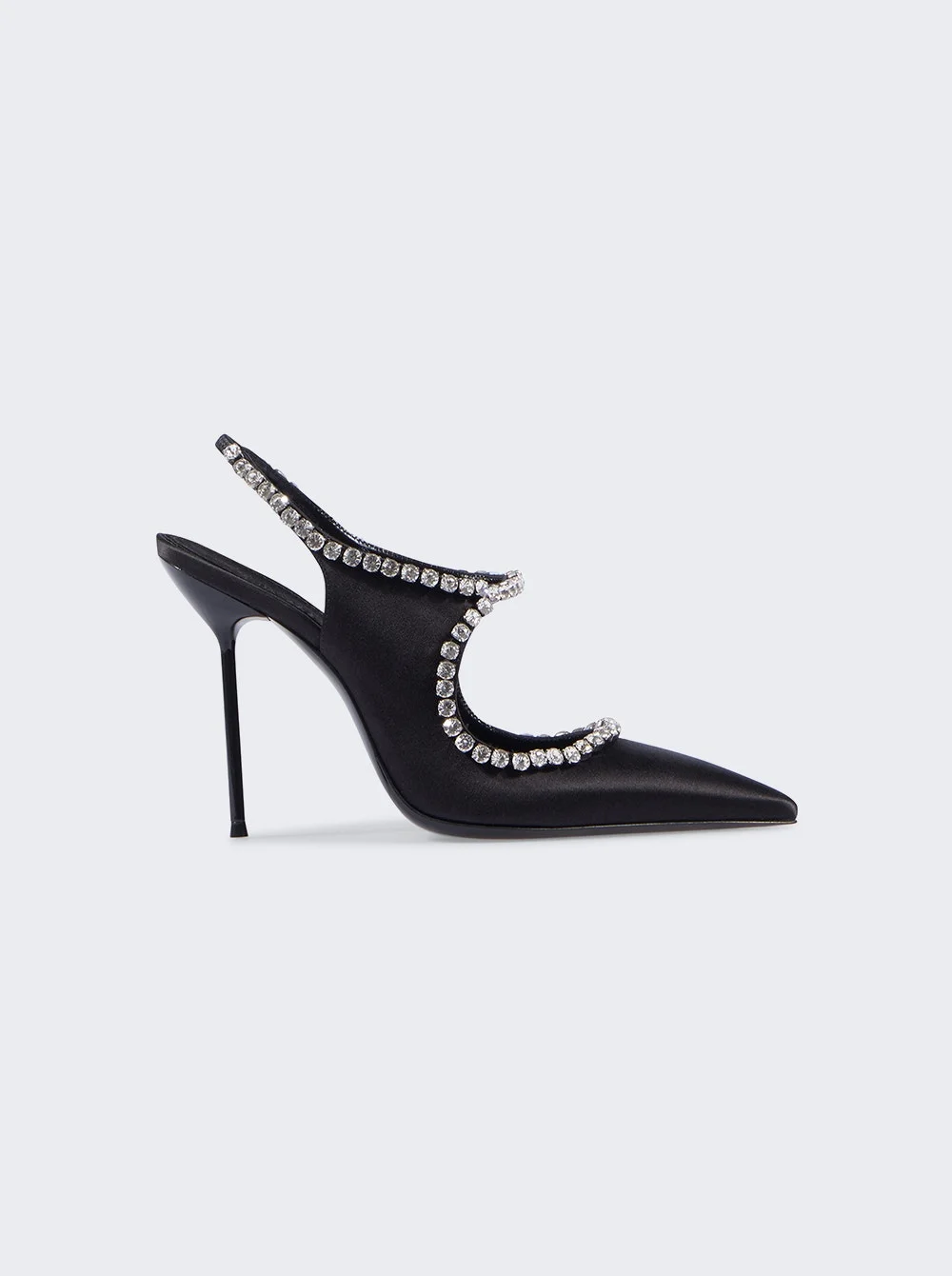 Details - Black satin slingback heels - Crystal stud embellishment - Pointed toe - Covered pin heel Size Information: Vendor Color Code: Brand Style: PX1768 Designer/Brand: PARIS TEXAS