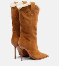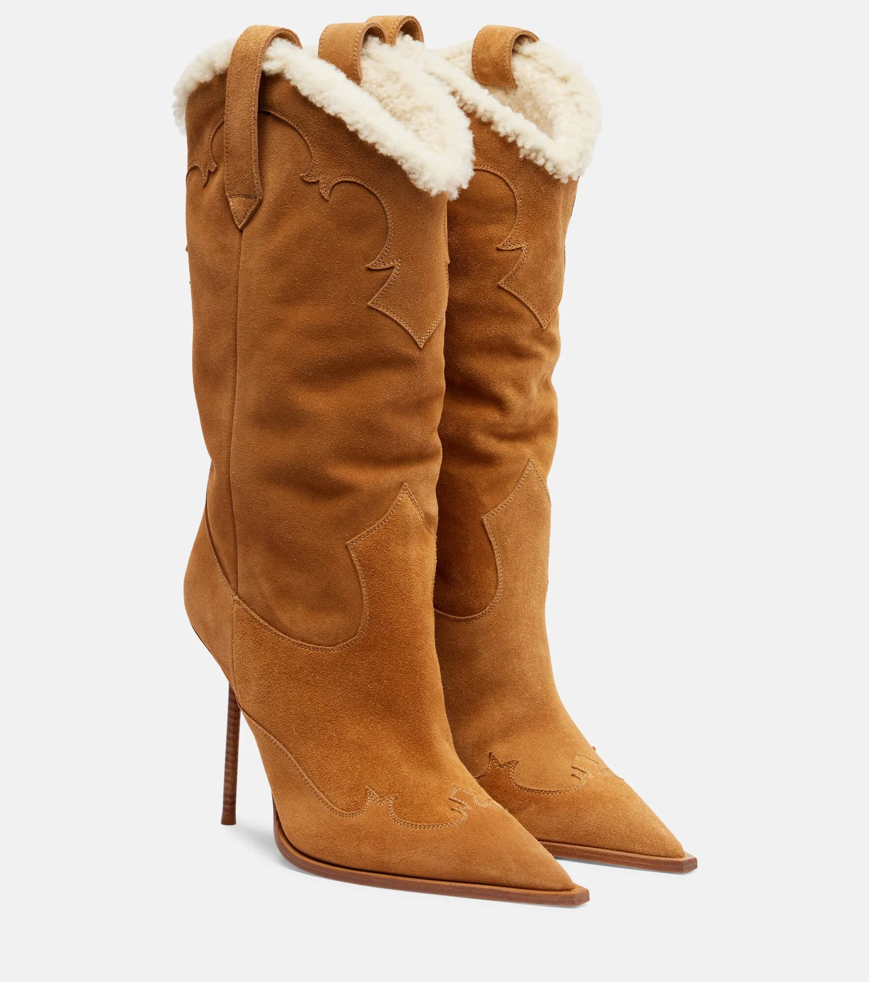 Paris Texas' Lidia cowboy boots are a suede silhouette with classic pointed toes and 105mm stiletto heels. The shearling-lined pair is finished with traditional embroidery and side pull tabs. Product Details - Upper: calf leather (suede) - Lining: shearling - Sole: leather insole and sole - Toe shape: pointed toe - Made in Italy - Includes: dust bag, shoe box - Designer color name: Cammello-Natural - Item color: brown - Trim: shearling - Item number: P01119941 Size & Fit - True to size - European sizes - 10.5cm-4" heel (size EU 38) - 30cm-12" shaft height (size EU 38) - 37cm-14.5" shaft width (size EU 38) - shaft width measured on largest part of boot