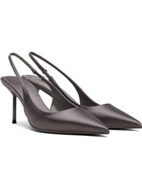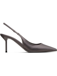 Satin heels. · Pointed toe · Elasticized slingback strap · Buffed leather lining · Lacquered stiletto heel with rubber injection · Leather sole · Heel: H3" Supplier color: Ash Upper: textile. Sole: leather, rubber. Made in Italy 252616F122018