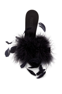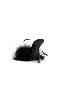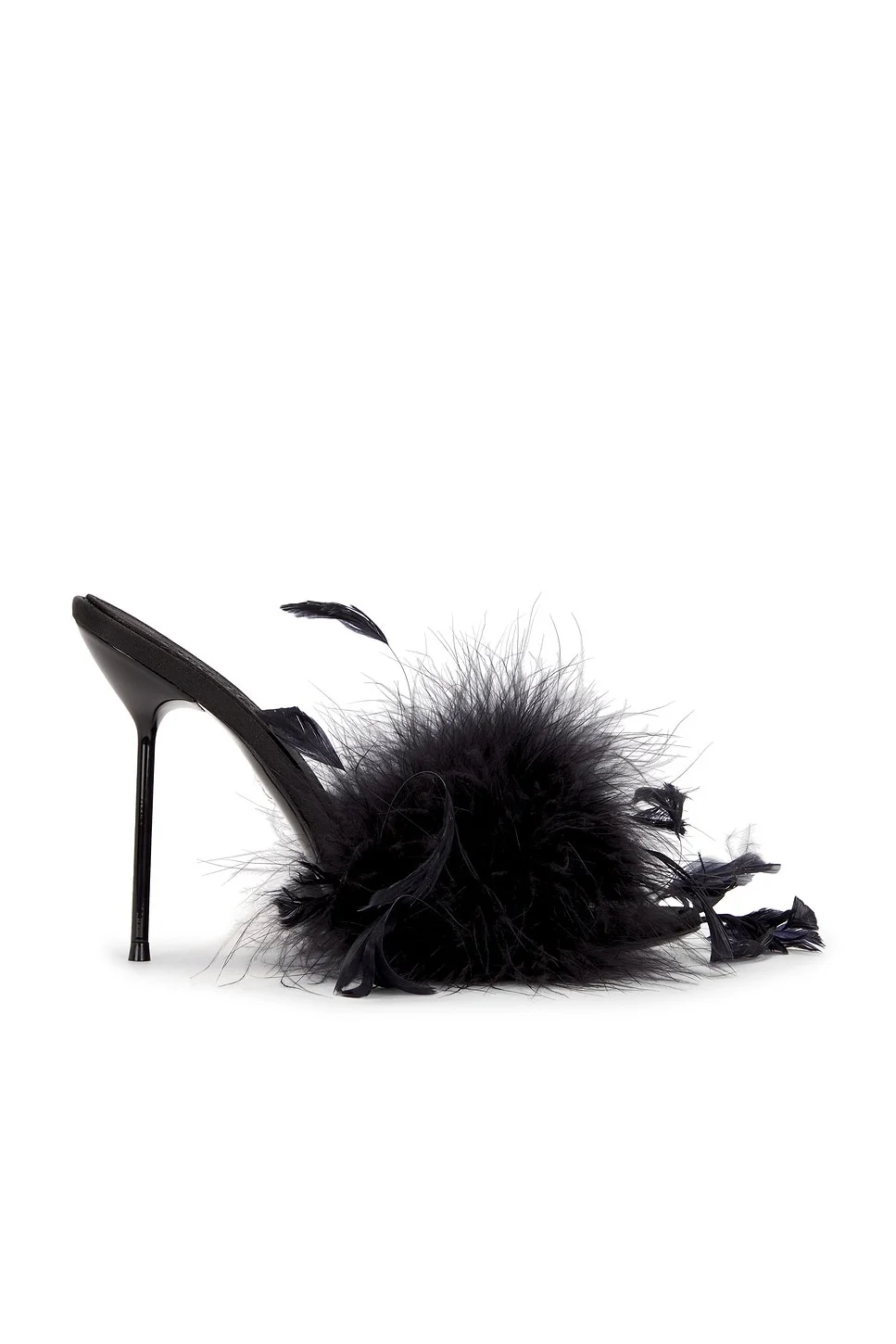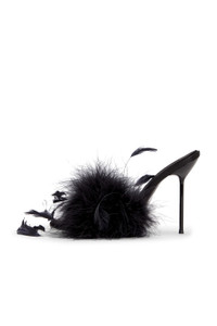 Details - Satin upper with feather embellishment and leather sole - Made in Italy - Slip-on styling - Leather lining - Almond toe - Stiletto heel - Approx 105mm/ 4.1 inch heel - Our Style No. PSTF-WZ280 - Manufacturer Style No. PX1573-XSATF0007