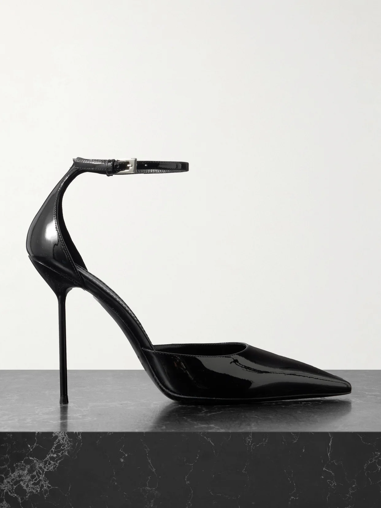 Paris Texas' 'Lidia' pumps are set on pin-thin stiletto heels that sharpen the classic silhouette. They've been made in Italy from glossy patent-leather and have pointed toes and adjustable ankle straps featuring silver-tone buckles.