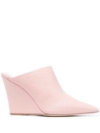 Wanda pointed toe 100mm mules Named after its seamless blend of craftsmanship and Western-inspired silhouettes, Paris Texas takes a unique take on footwear for the season. Made in Italy from smooth calf leather, the Wanda mules are rendered in a pale shade of pink whilst sitting atop a high wedge heel. Highlights - Light pink - Calf leather - Pointed toe - Branded insole - High wedge heel Made in Italy Composition Outer: Calf Leather 100% Sole: Calf Leather 100% Lining: Calf Leather 100% SIZE & FIT Measurement HEEL 3.93 in(10 cm)