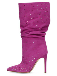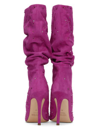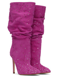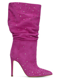 Mid-calf suede boots in pink. Gathering and crystal-cut detailing throughout. · Pointed toe · Grained leather lining · Covered stiletto heel with rubber injection · Nubuck sole · Heel: H4 in Supplier color: Pink ruby Leather. Made in Italy 222616F114019