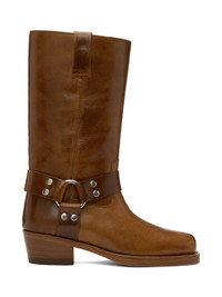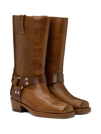 Mid-calf grained calfskin boots in brown. · Square toe · Harness-style ankle straps · Pull-loops at collar · Buffed leather lining · Stacked leather block heel with rubber injection · Leather sole · Heel: H2" Supplier color: Cuoio Upper: calfskin. Sole: leather, rubber. Made in Italy 242616F114000