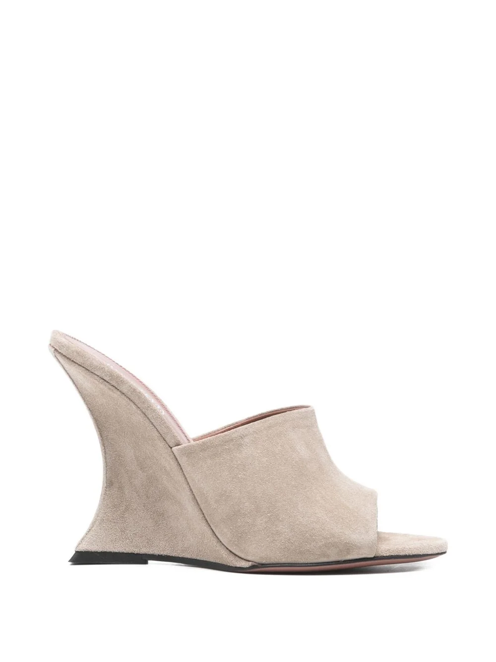 suede mules Highlights - Beige - Wedge heel - Curved heel - Open back Made in Italy Composition Outer: Calf Suede 100% Sole: Calf Leather 100% Lining: Calf Leather 100% SIZE & FIT Measurement HEEL 3.93 in(10 cm)
