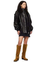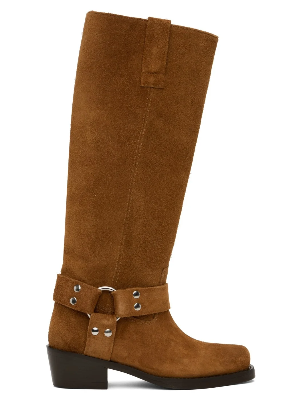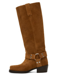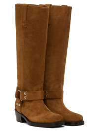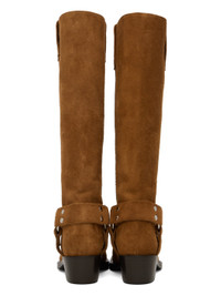 Knee-high calfskin suede boots in tan. · Square toe · Pull-loops at collar · Straps and O-ring hardware at sides · Buffed leather lining · Topstitching at welt · Stacked leather block heel with rubber injection · Leather sole · Heel: H1.75" Supplier color: Rhum