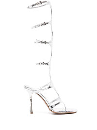 Uma 100mm metallic sandals Highlights - Silver-tone - Calf leather - Snakeskin effect - Metallic effect - Square open toe - Thong strap - Side buckle fastening - Branded leather footbed - 100mm high heel - Leather outsole - Knee-high Made in Italy Composition Lining: Calf Leather 100% Outer: Calf Leather 100% Sole: Calf Leather 100% SIZE & FIT Measurement CIRCUMFERENCE 13.58 in(34.5 cm) HEEL 4.21 in(10.7 cm) HEIGHT 13.97 in(35.5 cm)