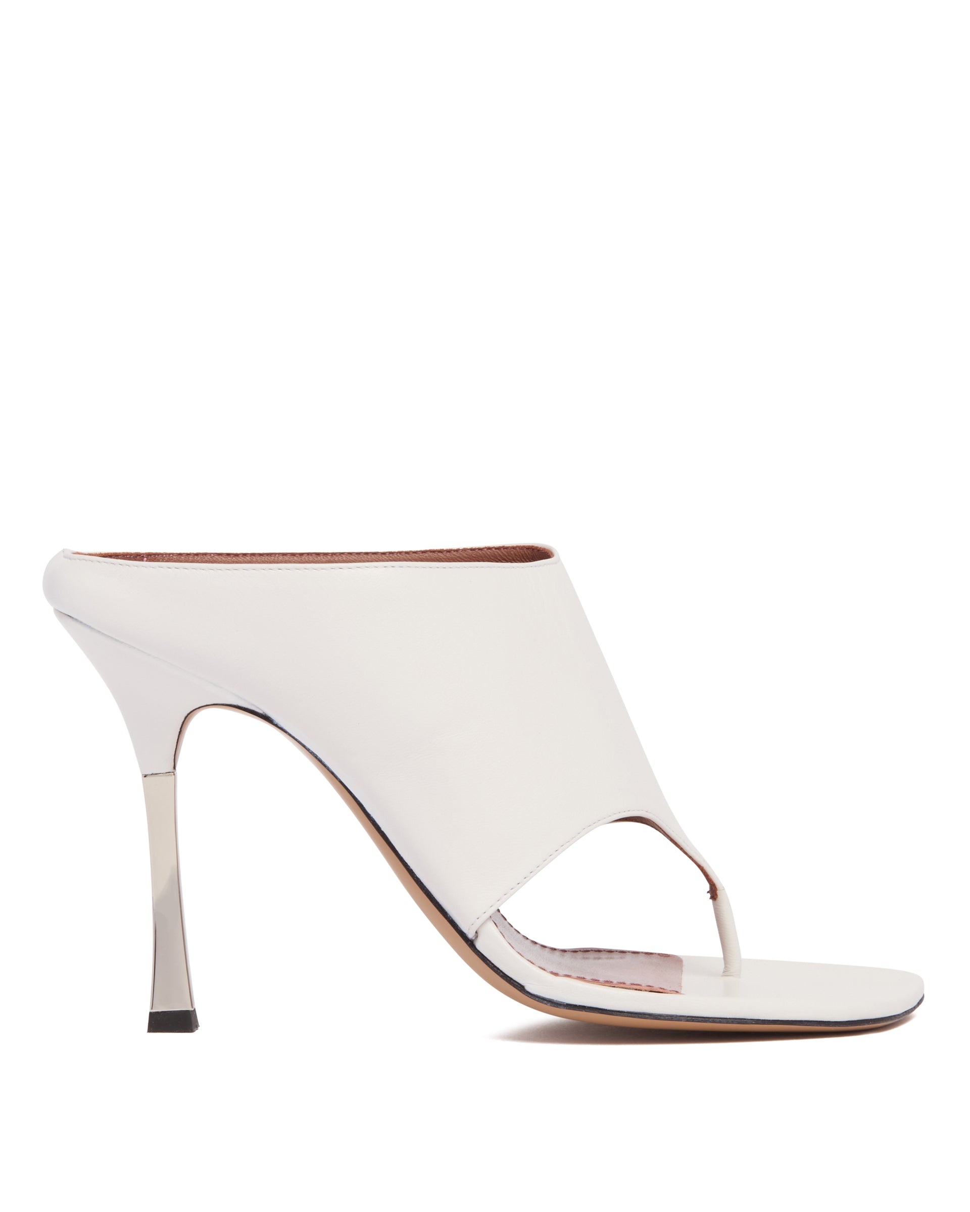 Paris Texas White Leather Flip Flop Mules. White leather upper, square toe, flip flop design, slip-on style. High glossy silver heel. Leather lining, branded insole. DETAILS Model: PX1603XNPP3WHITE Composition: 100% Leather Made in: ITALY Season: SS25