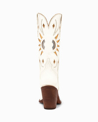 A glamorous cowboy boot handcrafted in a luxurious white leather with metallic cutouts and stitching and a higher 90mm/3.54" heel. PRODUCT DESCRIPTION Pull on mid calf boot with classic cowboy silhouette. Calfskin upper with metallic details. 90mm/3.54" heel height. 6mm padded insole. Leather lining. Leather outsole with stitched welt. Signature Partlow plaque. Handcrafted in Italy. DETAILS AND CARE Brush off any dust or dirt with a soft bristle brush or soft cloth. Store boots in protective dustbags provided between wearings.