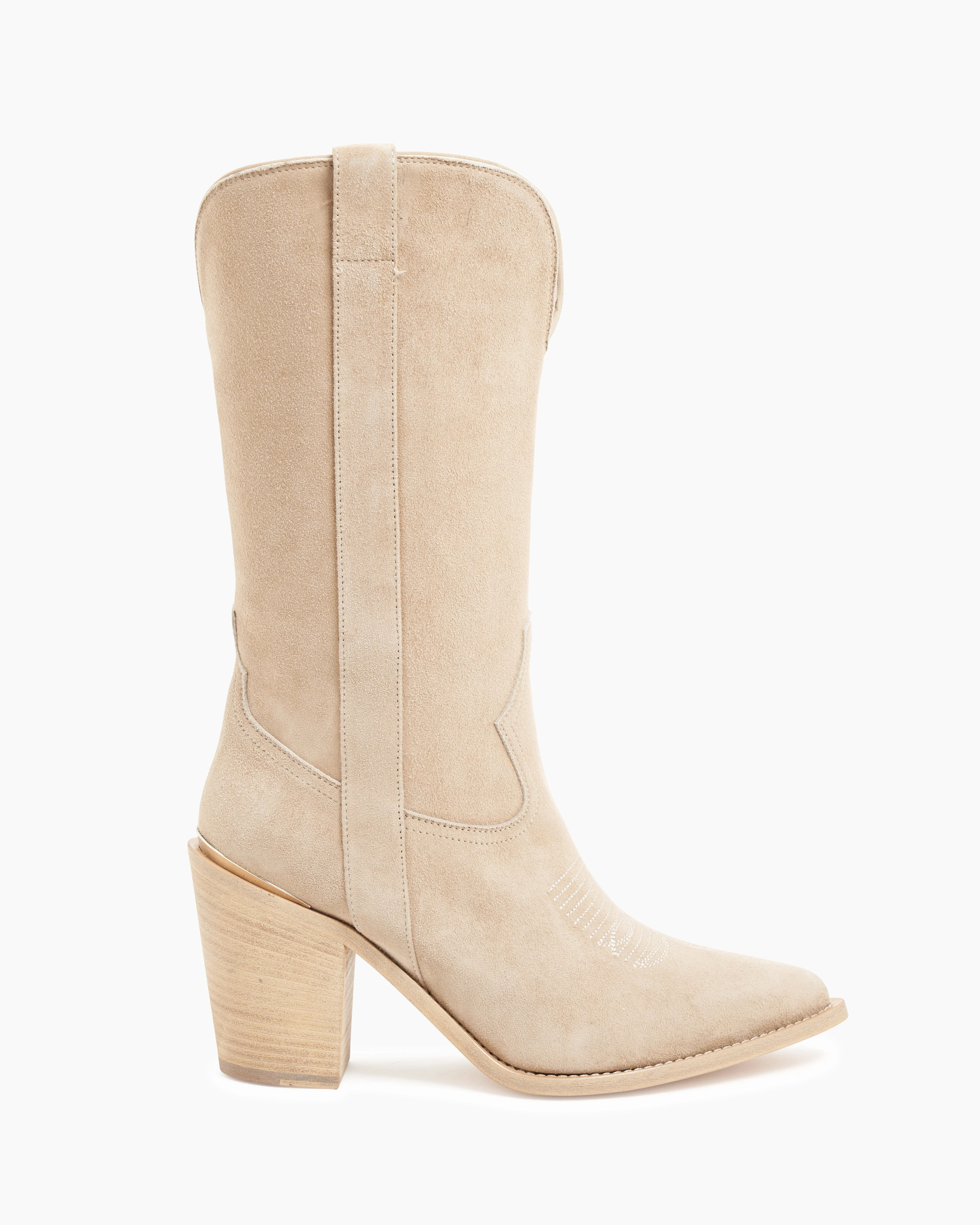 A luxurious sand suede cowboy boot with tonal stripe details. PRODUCT DESCRIPTION Pull on classic cowboy silhouette created from a suede upper with side stripe details, leather lining, and leather outsole with stitched welts. Heel height: 90mm/3.54”, 6mm padded insole. Featuring the signature Partlow plaque. Handcrafted in Italy. DETAILS AND CARE Brush off any dust or dirt with a soft bristle brush or soft cloth. Store boots in protective dustbags provided between wearings.