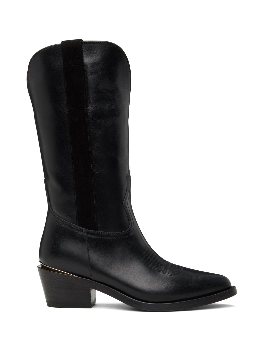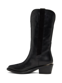 Mid-calf vegetable-dyed buffed leather boots in black. · Pointed toe · Embroidered detailing at vamp · Suede pull-loops at collar extend to sides · Logo plaque at heel counter · Padded insole · Stacked leather block heel with rubber injection · Leather sole · Heel: H2.25" Supplier color: Nero