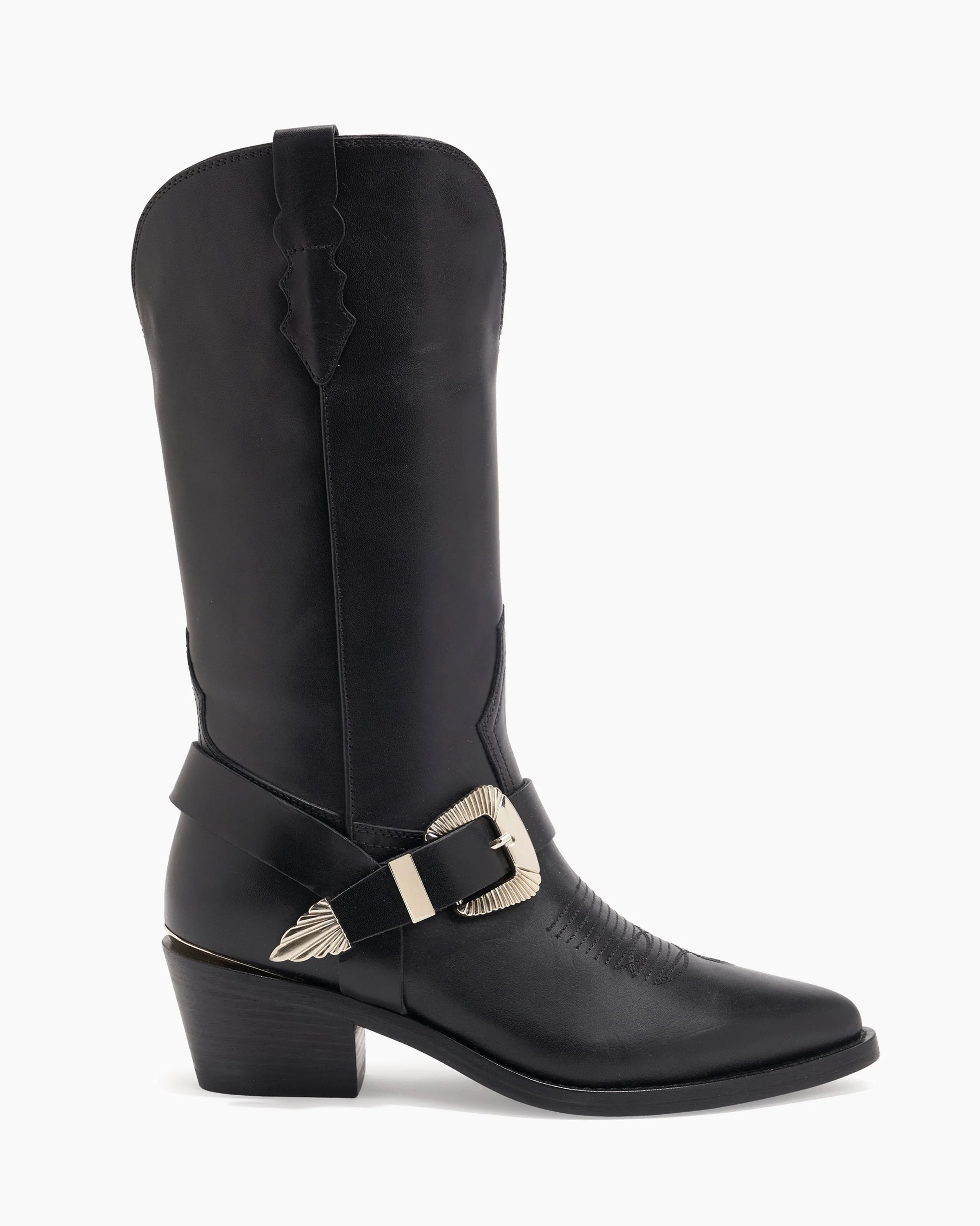 A classic black leather cowboy silhouette with ornate buckle detailing. PRODUCT DESCRIPTION Pull on classic cowboy silhouette. Vegetable-dyed calf w/ ankle buckle detail. 55mm / 2.16” heel height. 6mm padded insole. Leather lining. Leather outsole with stitched welt. Signature Partlow plaque. Handcrafted in Italy. DETAILS AND CARE Brush off any dust or dirt with a soft bristle brush or soft cloth. Store boots in protective dustbags provided between wearings.
