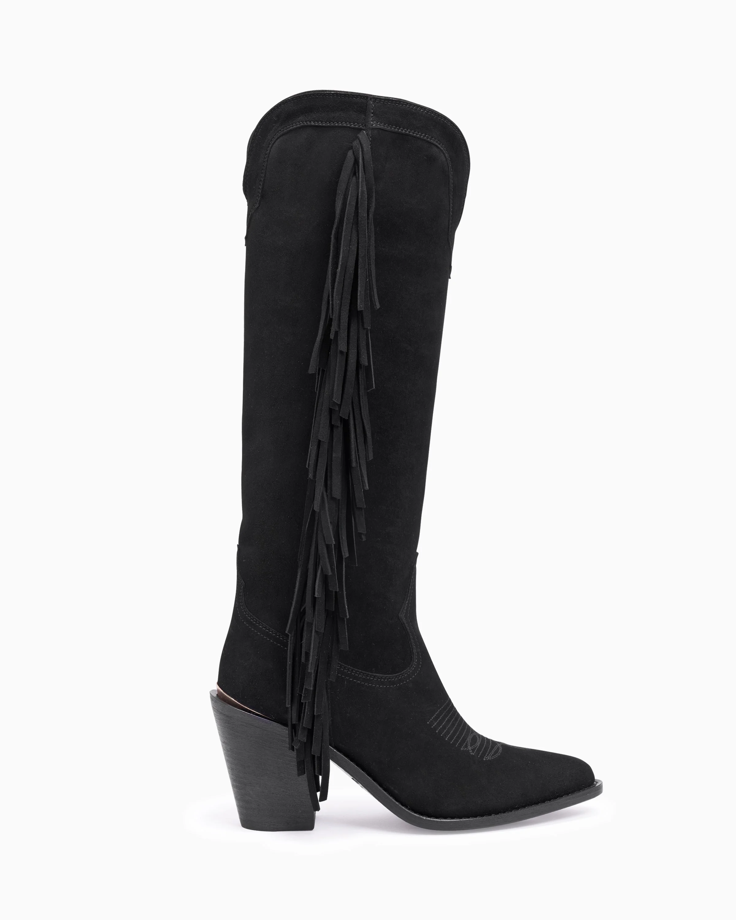 A seductive knee-high black suede cowboy boot with tonal top stitching and fringed sides. PRODUCT DESCRIPTION Pull on knee high boot with fringe details. Suede upper. 90mm/3.54" heel height. 6mm padded insole. Leather lining. Leather outsole with stitched welt. Signature Partlow plaque. Handcrafted in Italy. DETAILS AND CARE Brush off any dust or dirt with a soft bristle brush or soft cloth. Store boots in protective dustbags provided between wearings.