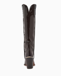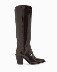 A contemporary knee high cowboy boot in brown patent leather. PRODUCT DESCRIPTION Pull on classic western style boot silhouette created from soft patent leather upper with leather lining and a leather outsole with stitched welt. Heel height: 90mm/3.54", 6mm padded insole. Featuring the signature Partlow plaque. Handcrafted in Italy. DETAILS AND CARE Brush off any dust or dirt with a soft bristle brush or soft cloth. Store boots in protective dustbags provided between wearings.