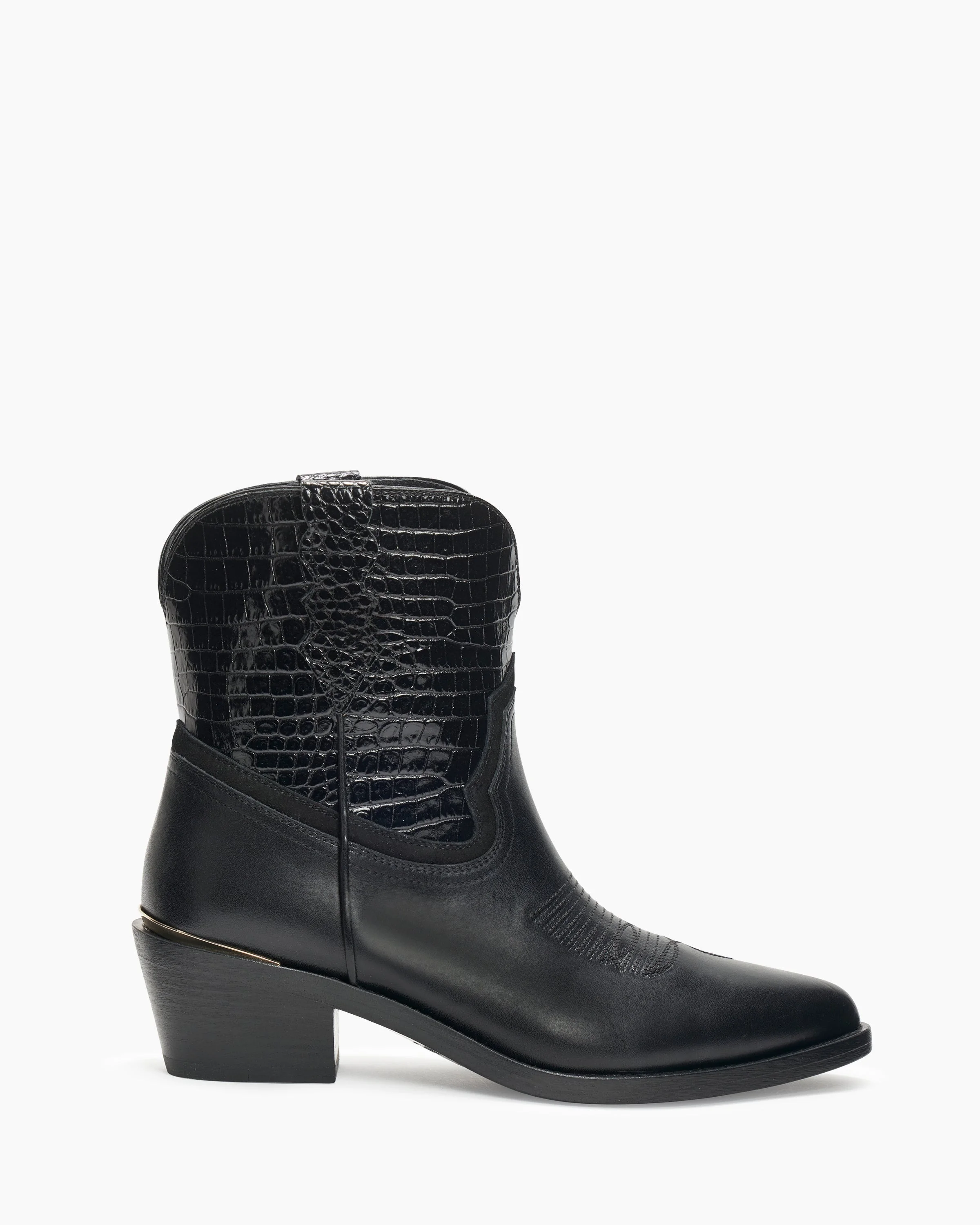 A multi-textured classic cowboy ankle boot handcrafted from smooth and embossed black calfskin. PRODUCT DESCRIPTION Pull on ankle boot with classic cowboy silhouette crafted from a smooth and an embossed calfskin upper, leather lining, and leather outsole with stitched welt. Heel height: 55mm/2.17", 6mm padded insole. Featuring the signature Partlow plaque. Handcrafted in Italy. DETAILS AND CARE Brush off any dust or dirt with a soft bristle brush or soft cloth. Store boots in protective dustbags provided between wearings.
