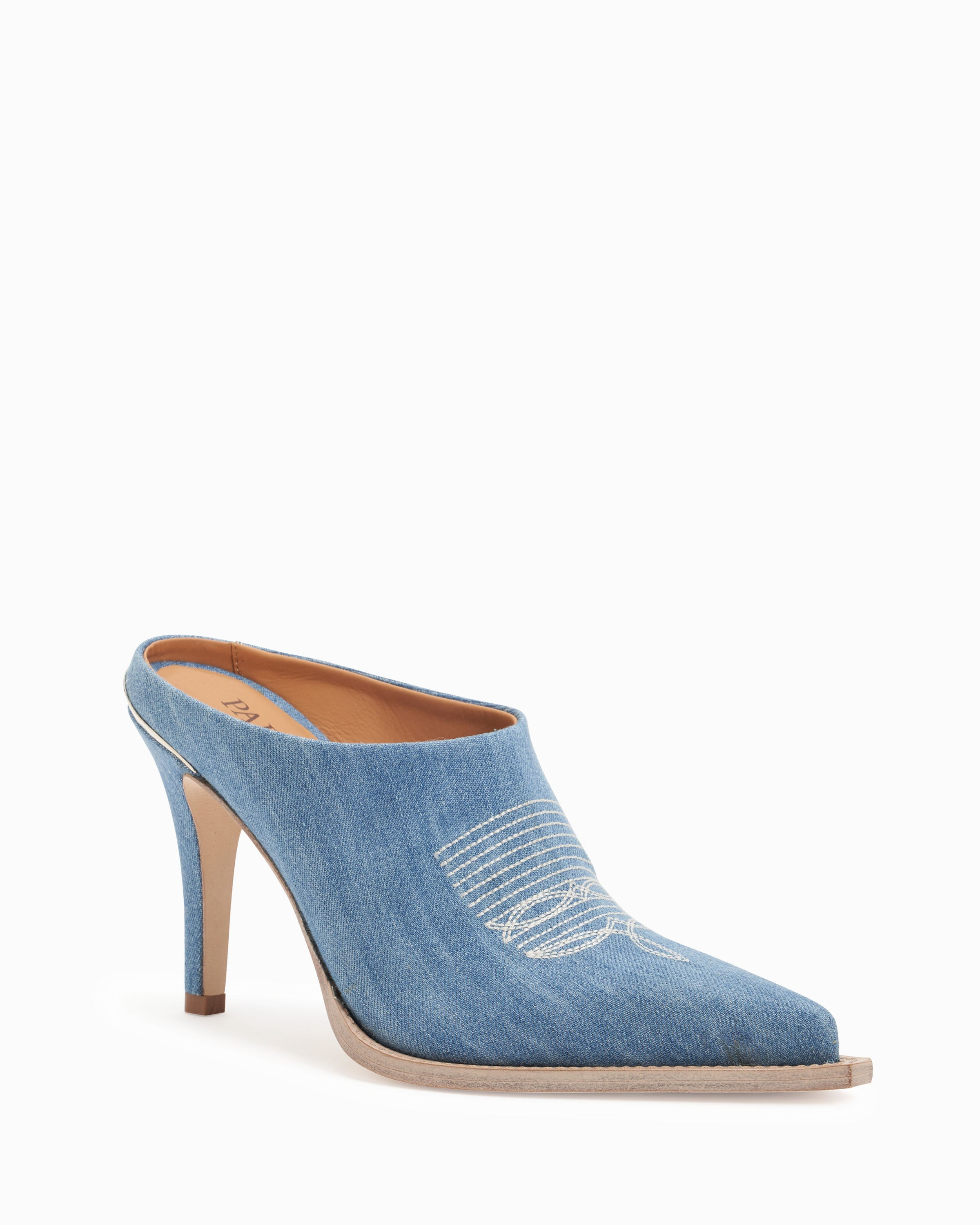 A Western-inspired embroidered denim mule. PRODUCT DESCRIPTION Slip on mule. Denim fabric upper with stitch detailing on vamp. 95mm/3.75" heel height. 6mm padded insole. Leather lining. Leather outsole with stitched welt. Signature Partlow plaque. Handcrafted in Italy. DETAILS AND CARE Brush off any dust or dirt with a soft bristle brush or soft cloth. Store boots in protective dustbags provided between wearings.