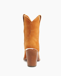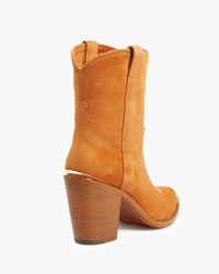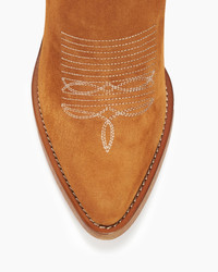 A luxurious warm camel suede cowboy ankle boot with tonal stripe details. PRODUCT DESCRIPTION Pull on ankle boot with classic cowboy silhouette created from a suede upper with side stripe details, leather lining, and leather outsole with stitched welts. Heel height: 90mm/3.54”, 6mm padded insole. Featuring the signature Partlow plaque. Handcrafted in Italy. DETAILS AND CARE Brush off any dust or dirt with a soft bristle brush or soft cloth. Store boots in protective dustbags provided between wearings.