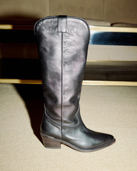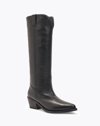 An elegant knee-high Western Boot crafted from supple black nappa leather, designed by Adam Lippes x Partlow. PRODUCT DESCRIPTION Pull-on knee high boot. Classic cowboy silhouette Nappa upper. 55mm/2.16" heel height. 6mm padded insole. Leather lining. Leather outsole with stitched welt. Signature Partlow plaque. Handcrafted in Italy. DETAILS AND CARE Brush off any dust or dirt with a soft bristle brush or soft cloth. Store boots in protective dustbags provided between wearings.