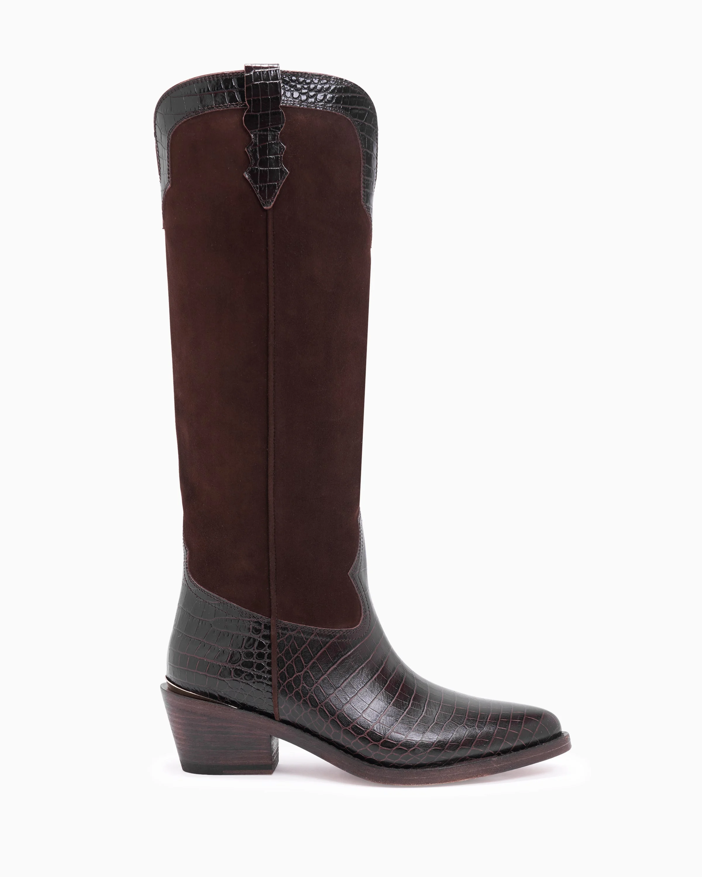 A daring rich chocolate croc-embossed leather and suede knee high cowboy boot. PRODUCT DESCRIPTION Pull on knee high boot with western details. Suede and Croc embossed calfskin upper. 55mm/2.16" heel height. 6mm padded insole. Leather lining. Leather outsole with stitched welt. Signature Partlow plaque. Handcrafted in Italy. DETAILS AND CARE Brush off any dust or dirt with a soft bristle brush or soft cloth. Store boots in protective dustbags provided between wearings.
