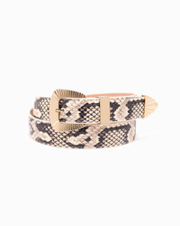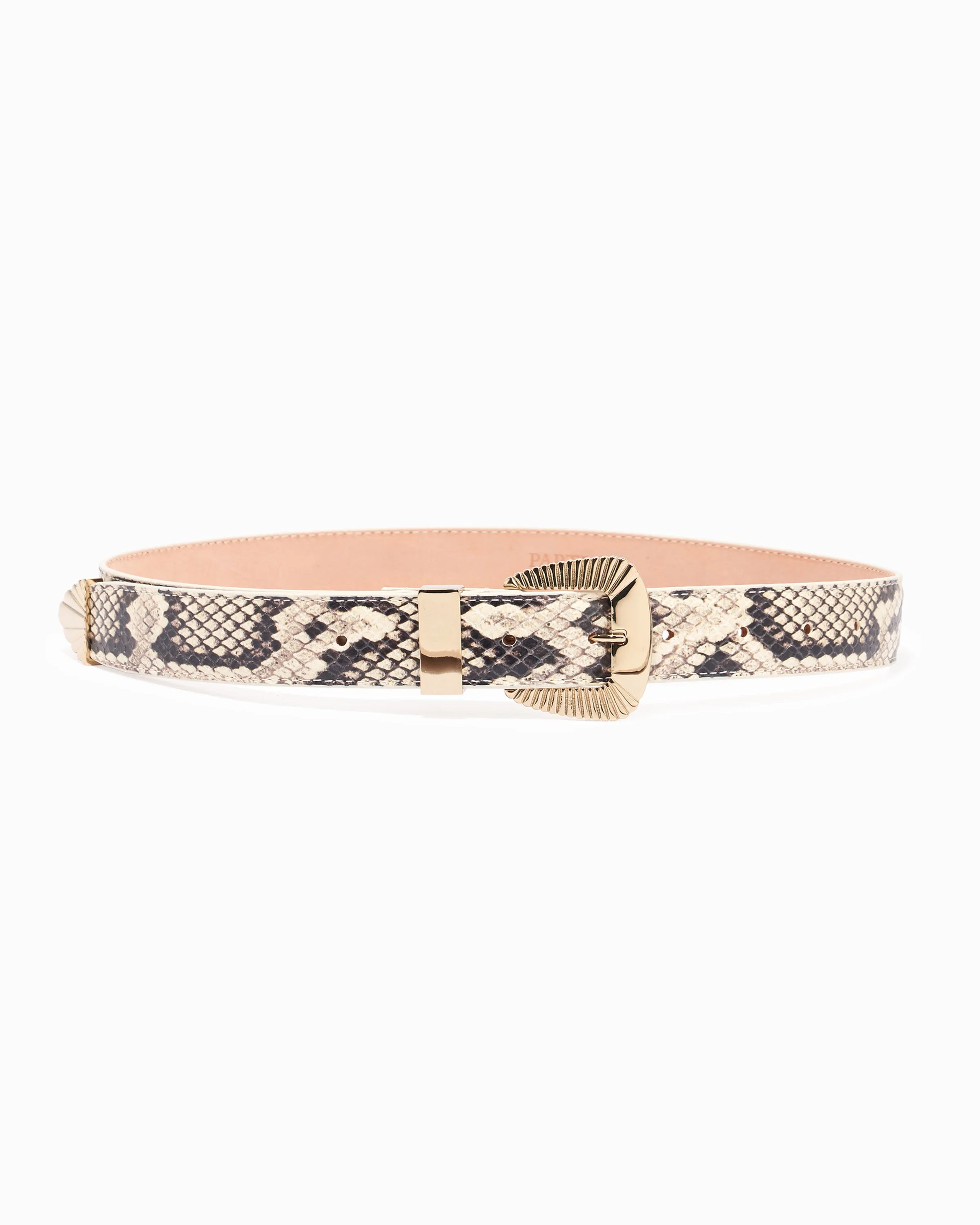 A luxuriously simple python-printed leather belt with signature Partlow buckle. PRODUCT DESCRIPTION Classic belt in printed leather with signature Partlow buckle. Handcrafted in Italy. XS is 63-80cm (25-31”); S is 73-90cm (28-35”); M is 83-100cm (32-39”); L is 93-110cm (36-43”). The distance from the first to last hole is 17cm/6.6in, with 2cm between each hole.