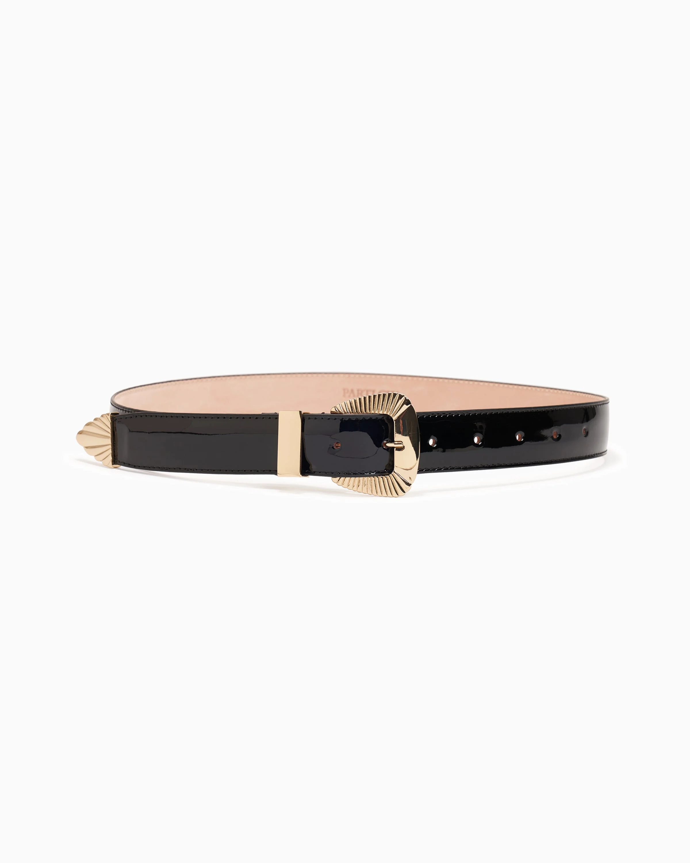 A luxuriously simple black patent leather belt with signature Partlow buckle. PRODUCT DESCRIPTION Classic belt in leather with signature Partlow buckle. Handcrafted in Italy. XS is 63-80cm (25-31”); S is 73-90cm (28-35”); M is 83-100cm (32-39”); L is 93-110cm (36-43”). The distance from the first to last hole is 17cm/6.6in, with 2cm between each hole.